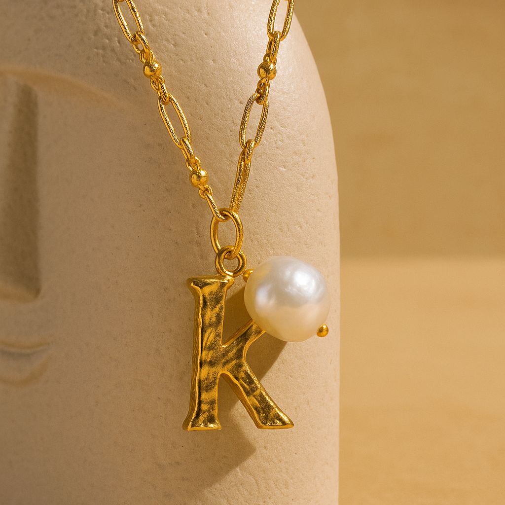 Our Initial Pendant featuring hammered gold texture and a baroque pearl drop is personal, playful, and effortlessly elegant. Just the perfect personalized gift for any occasion.